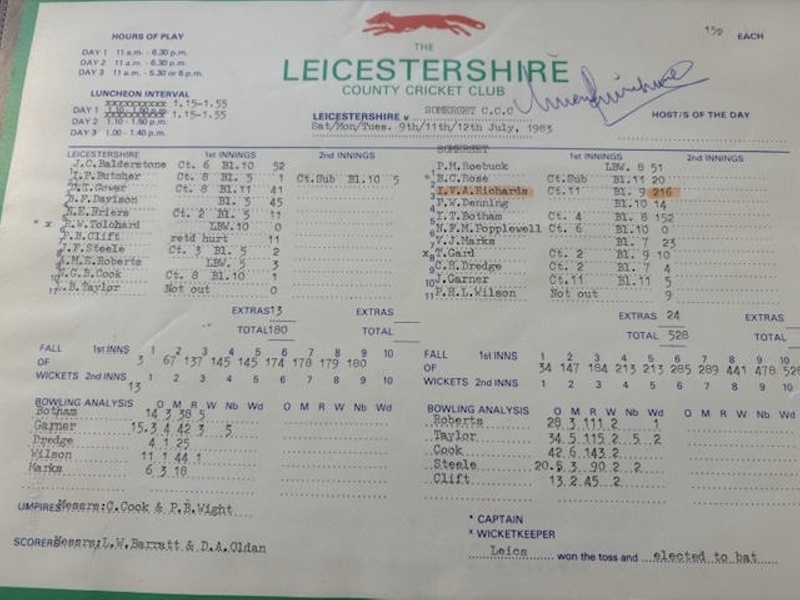 About this objectAutographed Scorecard - Somerset v Leicestershire 1983 - Viv Richards 216