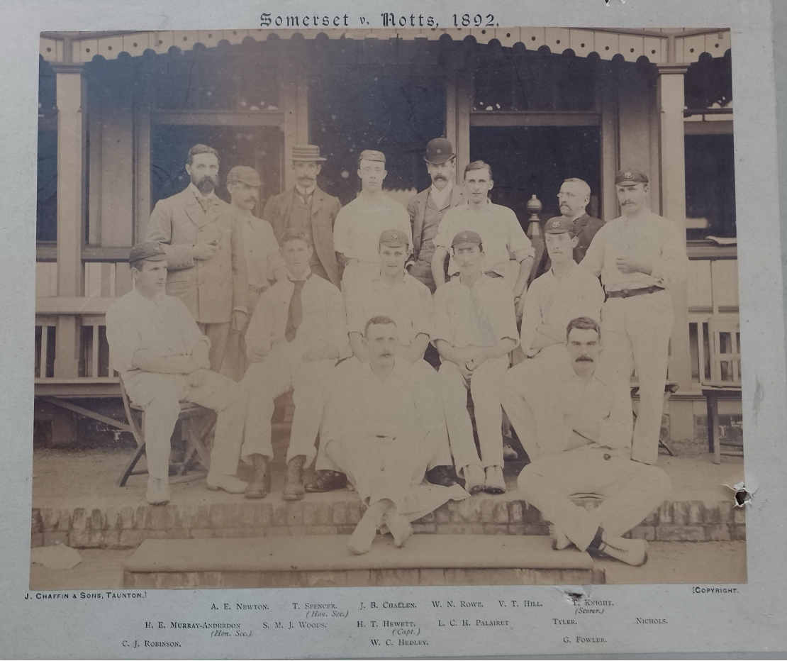 In the 1892 season, Somerset, in their second year as a first class county finished 3rd in the County Championship with 8 wins including beating Surrey, the 1891 Champions. Notably the selection process was changed to be based on merit rather than social achievements (aka drinking). Of mention are: A.E. Newton, T.Knight (Scorer), H.E. Murray Anderdon (Secretary), S.M.J. Woods, H. Hewitt, L. Palairet, T. Tyler and V.T. Hill.
